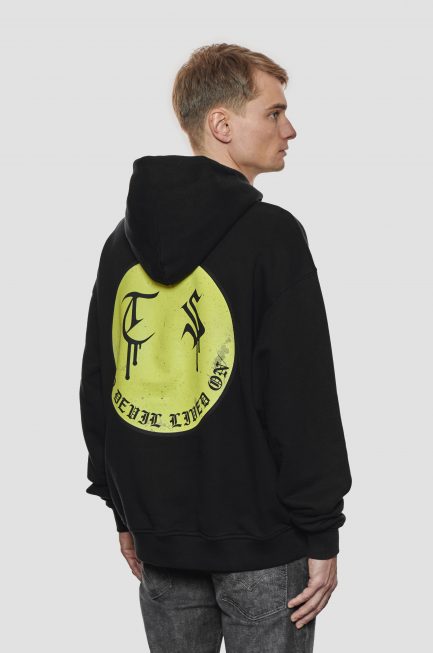 OUR DEVIL HOODIE REFLECTS THE DARKEST LEVEL OF OUR SOUL. THE GRINNING SMILEY DESCRIBES THE SUCCESSFUL TRANSFORMATION OF NEGATIVE EMOTIONS TO POSITIVE ONES. WHILE THE QUOTE “NO DEVIL LIVED ON” QUESTIONS WHETHER DARK MOODS AND EXPERIENCES ARE REALLY OVERCOME. THE QUOTE IS A PALINDROME SO IT MEANS THE SAME WHEN YOU READ IT BACKWARDS.