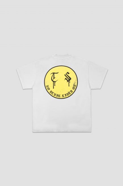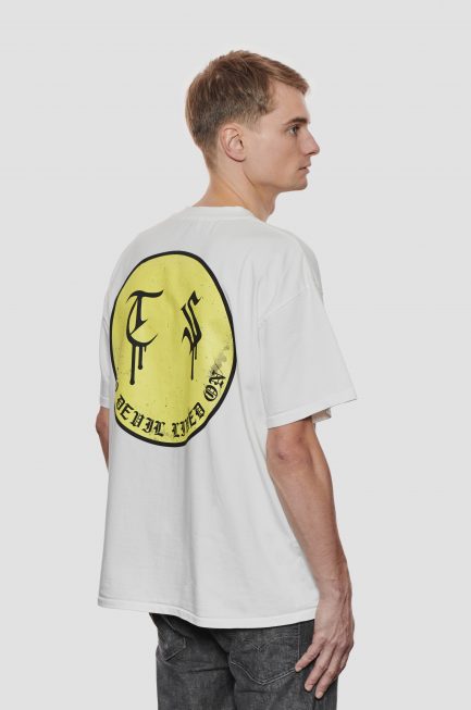 OUR DEVIL TEE REFLECTS THE DARKEST LEVEL OF OUR SOUL. THE GRINNING SMILEY DESCRIBES THE SUCCESSFUL TRANSFORMATION OF NEGATIVE EMOTIONS TO POSITIVE ONES. WHILE THE QUOTE “NO DEVIL LIVED ON” QUESTIONS WHETHER DARK MOODS AND EXPERIENCES ARE REALLY OVERCOME. THE QUOTE IS A PALINDROME SO IT MEANS THE SAME WHEN YOU READ IT BACKWARDS.